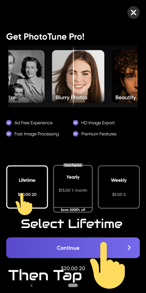 - Select Lifetime then tap Continue